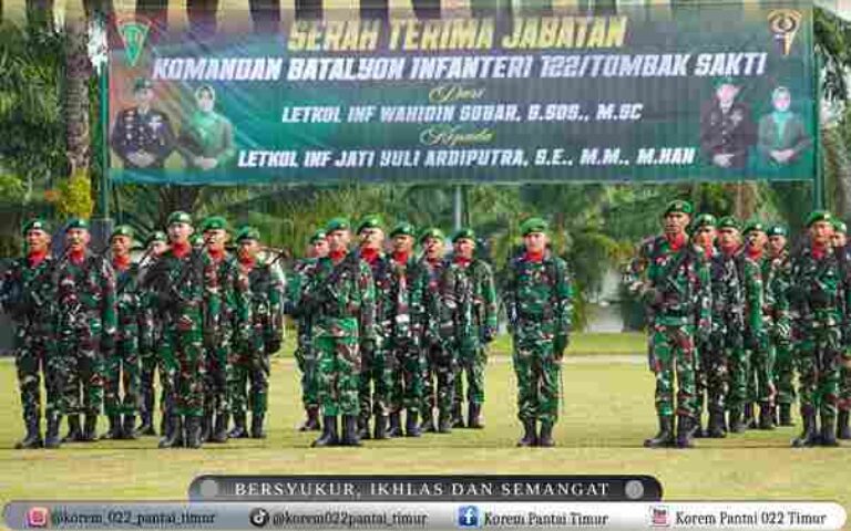 Danyonif 122/TS Letkol Inf Wahidin Sobar S.Sos MSc., memberikan apresiasi kepada Personel Yonif 122/TS Pratu Setyo Febrian atas tindakannya membantu masyarakat yang mendapat musibah serta turut berperan dalam memberantas Curanmor dan Begal.
