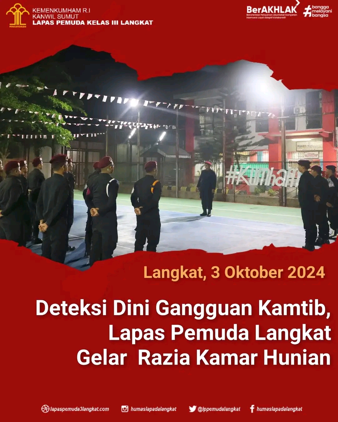 Langkat || NewsLentera, Dalam rangka menciptakan kemanan dan ketertiban serta situasi yang kondusif, Jajaran Lapas Pemuda Langkat Kanwil Kemenkumham Sumut Gelar Deteksi Dini Razia ke blok hunian, Kamis (03/10/2024).