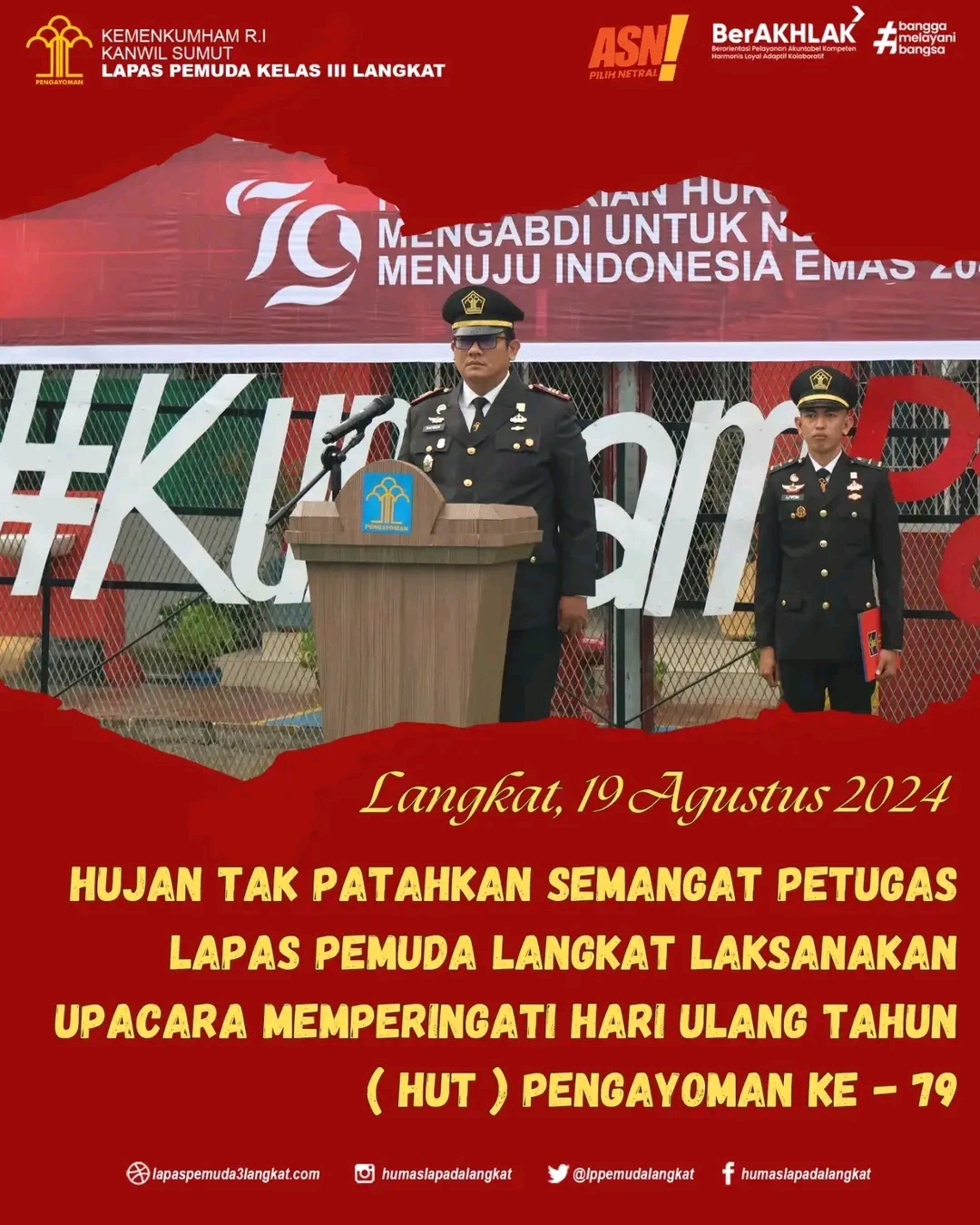 Langkat || NewsLentera, Walau Langit sedang menurunkan hujan, namun tidak mematahkan semangat petugas lapas pemuda langkat untuk melaksanakan upacara bendera dan acara syukuran dalam rangka memperingati Hari Ulang Tahun ( HUT ) Pengayoman Ke – 79. Upacara berlangsung penuh khidmat di Lapangan Lapas Pemuda Kelas III Langkat, yang diikuti oleh Bapak Kalapas Raymon Andika Girsang, Pejabat Struktural, Seluruh Petugas Lapas Pemuda Langkat, Dharma Wanita Persatuan Lapas Pemuda Langkat dan Perwakilan dari Warga Binaan Pemasyarakatan, Senin ( 19/08 ).