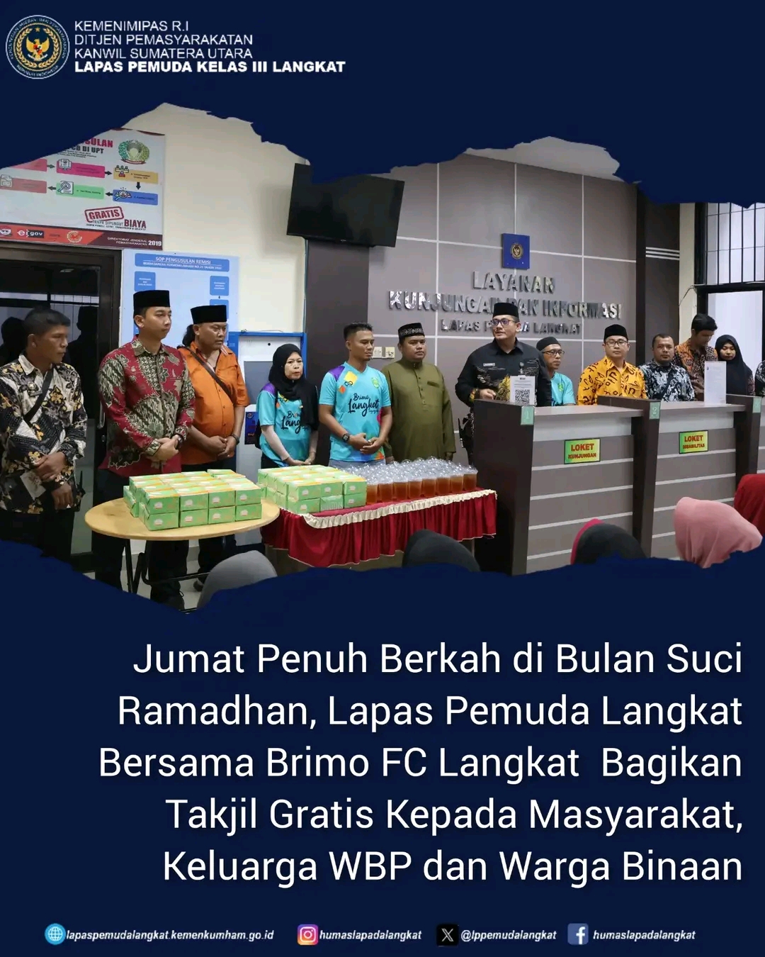 Langkat || NewsLentera, Dalam rangka Jumat Penuh Berkah Di Bulan suci Ramadan dimanfaatkan Lapas Pemuda Kelas III Langkat berkolaborasi dengan Brimo FC Langkat dengan berbagi takjil kepada masyarakat, keluarga WBP dan warga binaan. Kegiatan ini bertujuan untuk mempererat tali silaturahmi dengan wbp dan masyarakat, serta memberikan kemudahan bagi umat Muslim yang sedang menjalankan ibadah puasa. Jumat (14/03/2025).
