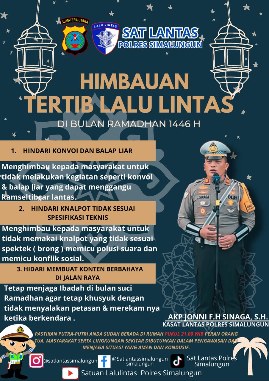 Simalungun || NewsLentera, Menyambut bulan suci Ramadhan 1446 H/2025 M, Polres Simalungun mengeluarkan imbauan tertib lalu lintas untuk menjaga keamanan, keselamatan, ketertiban, dan kelancaran lalu lintas (Kamseltibcarlantas) di wilayah hukum Polres Simalungun. Himbauan tersebut disampaikan oleh Kasat Lantas Polres Simalungun AKP Jonni Fatiaro H Sinaga, SH, sebagai upaya profesional Polri dalam pengamanan kamtibmas.