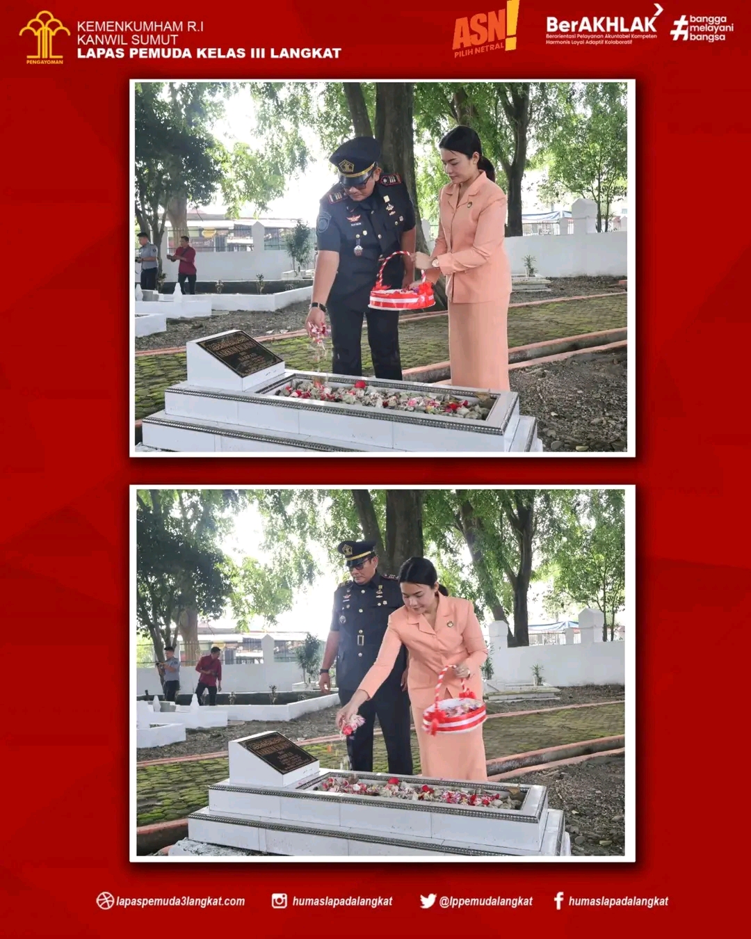 Selepas upacara, Bapak Kalapas Pemuda Langkat, Raymon Andika Girsang, Ketua DWP, Citra Sitepu, seluruh pejabat serta seluruh jajaran pegawai dan DWP Lapas Pemuda Langkat menuju makam untuk melakukan tabur bunga.