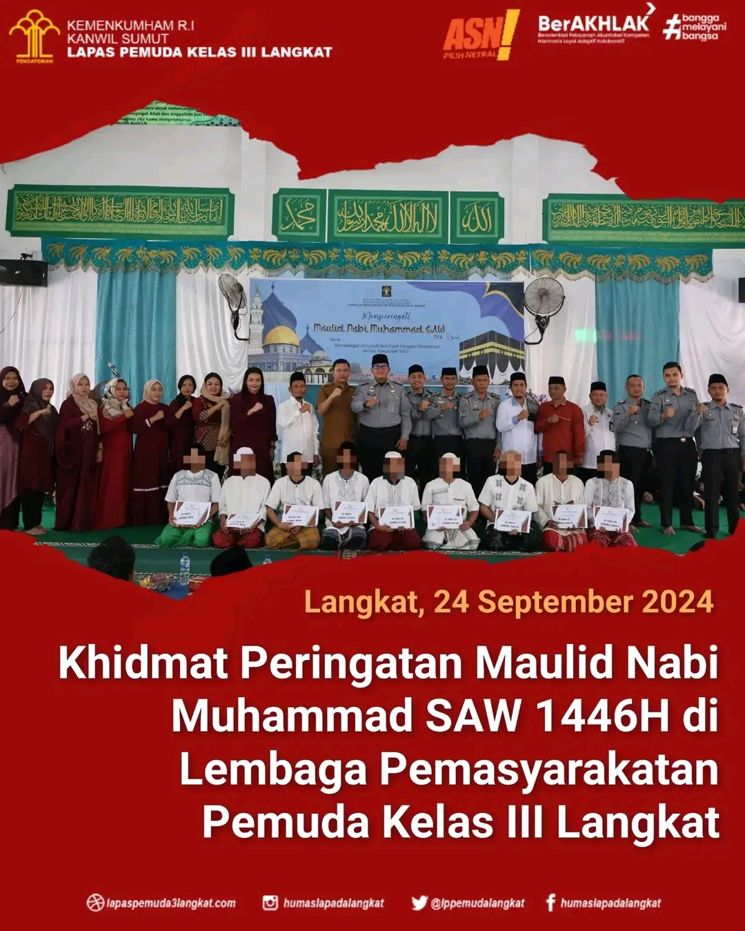 Langkat || NewsLentera, Lembaga Pemasyarakatan Pemuda Kelas III Langkat menggelar peringatan Maulid Nabi Muhammad SAW dengan tema “Membangun Ukhuwah Islamiyah dengan Meneladani Akhlah Rasulullah”. Acara ini dihadiri oleh berbagai tokoh penting, termasuk Kepala Kementerian Agama (Kemenag) Kabupaten Langkat, Camat Hinai, perwakilan Bank BSI Cabang Pangkalan Brandan, UPT Pemasyarakatan Rayon Langkat serta ibu-ibu Dharma Wanita Persatuan Lapas Pemuda Langkat, Selasa (24/09/2024).