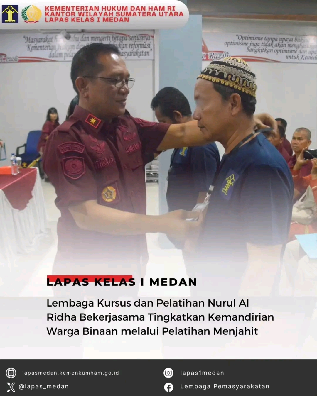 Medan || NewsLentera, Dalam upaya meningkatkan keterampilan dan kemandirian warga binaan, Lapas Kelas I Medan melaksanakan perjanjian kerjasama dengan Lembaga Kursus dan Pelatihan Nurul Al Ridha pada hari ini, Kamis Pagi (10/10/1024). Program ini berfokus pada pelatihan di bidang konveksi, khususnya menjahit, sebagai salah satu bentuk pembinaan bagi warga binaan.