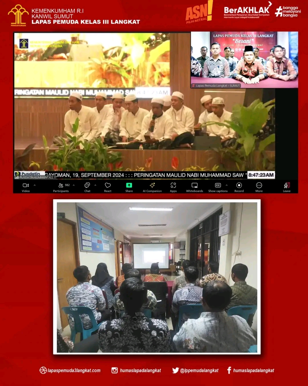 Langkat || NewsLentera, Dalam rangka memperingati Maulid Nabi Muhammad SAW, Lembaga Pemasyarakatan Pemuda Kelas III Langkat mengikuti secara virtual peringatan Maulid Nabi Muhammad SAW yang diselenggarakan oleh Kementerian Hukum dan HAM, Kamis (19/09/2024).