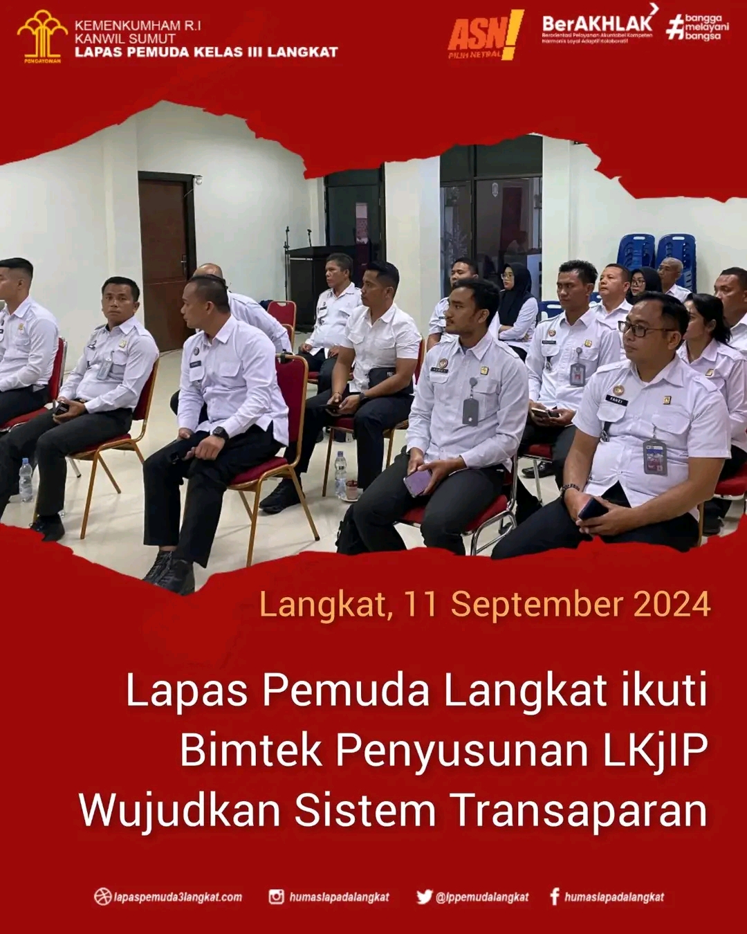 LANGKAT || NewsLentera, Lembaga Pemasyarakatan Pemuda Kelas III Langkat Kanwil Kemenkumham Sumut turut berpartisipasi dalam kegiatan bimbingan teknis (Bimtek) dan pendampingan penyusunan Laporan Kinerja Instansi Pemerintah (LKjIP) Tahun 2024 yang diselenggarakan Kantor Wilayah Kementerian Hukum dan HAM Sumatera Utara tahun 2024, Selasa (10/09/2024).