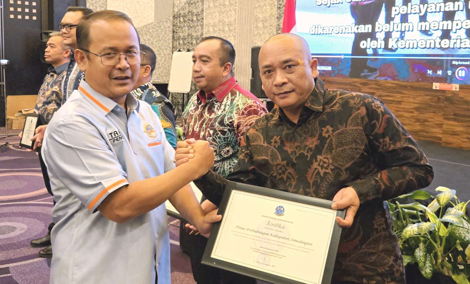 Jawa Barat || NewsLentera, Pemerintah Kabupaten (Pemkab) Simalungun sertifikat dari Kemeterian Perhubungan RI pada puncak Hari Ulang Tahun (HUT) Ikatan Penguji Kendaraan Bermotor ke-22 yang digelar di Hotel Holiday Inn Pasteur Bandung Jawa Barat, Kamis (29/8/2024).