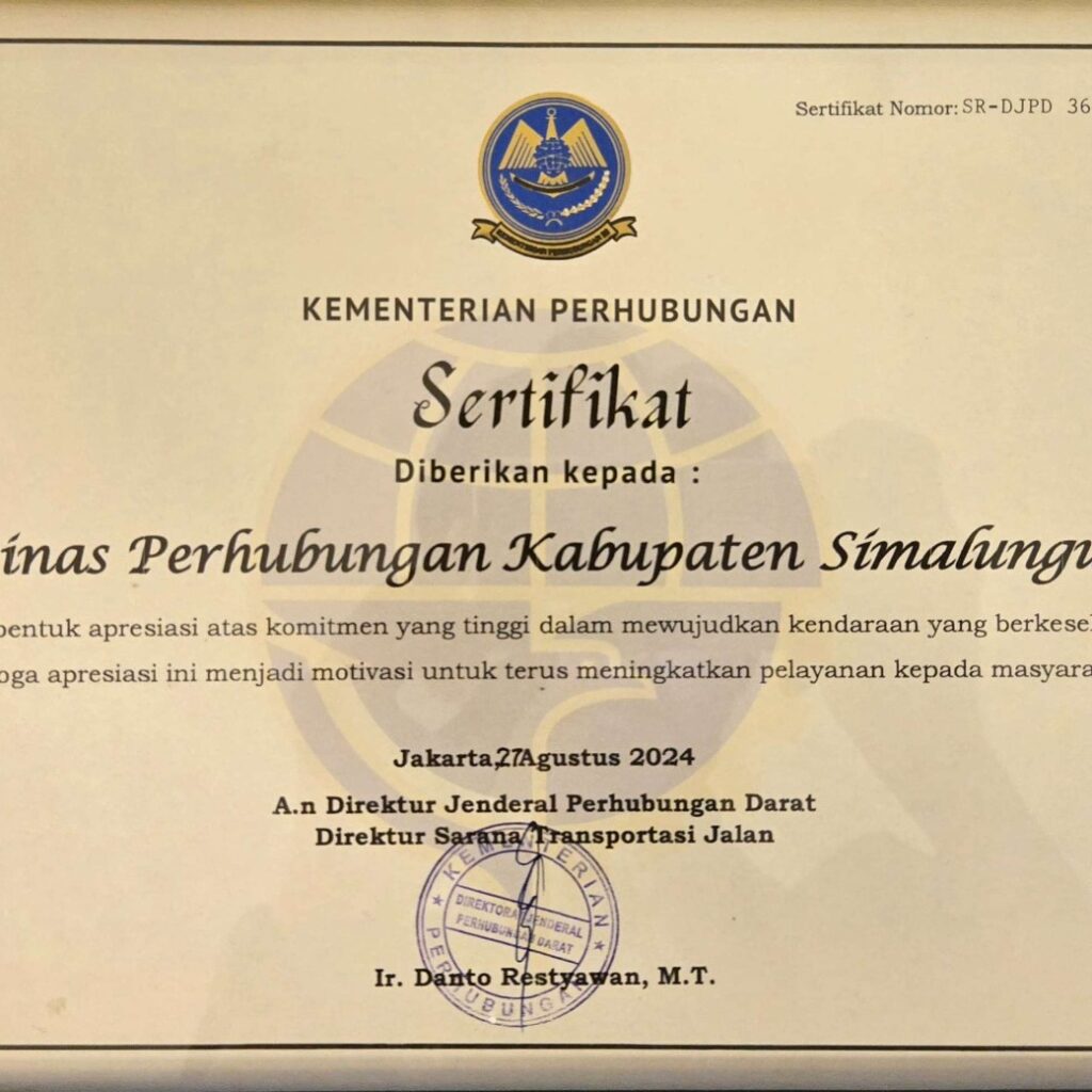 Sertifikat tersebut diterima oleh Bupati Simalungun diwakili Kadis Perhubungan Sabar Pardamean Saragih dari Direktur Sarana Transportasi Jalan, Danto Restyawan atas nama Dirjen Perhubungan Darat Kementerian Perhubungan RI.