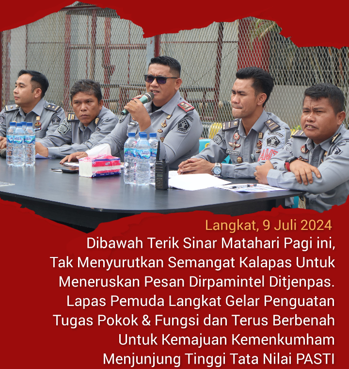 Langkat – NewsLentera.com – Panas dan teriknya matahari tidak menghalangi Lapas Pemuda Kelas III Langkat Kanwil Kemenkumham Sumut dalam menggelar Rapat Penguatan Tugas Pokok dan Fungsi meneruskan pesan Dirpamintel guna meningkatkan kompetensi ilmu pengamanan dan intelijen kepada seluruh jajaran sebagai komitmen untuk terus berbenah demi kemajuan Kemenkumham menjunjung tinggi tata nilai PASTI dalam pelaksanaan tugas. Selasa, (08/07/2024). Bertempat di Lapangan Gedung II Lapas Pemuda Langkat.