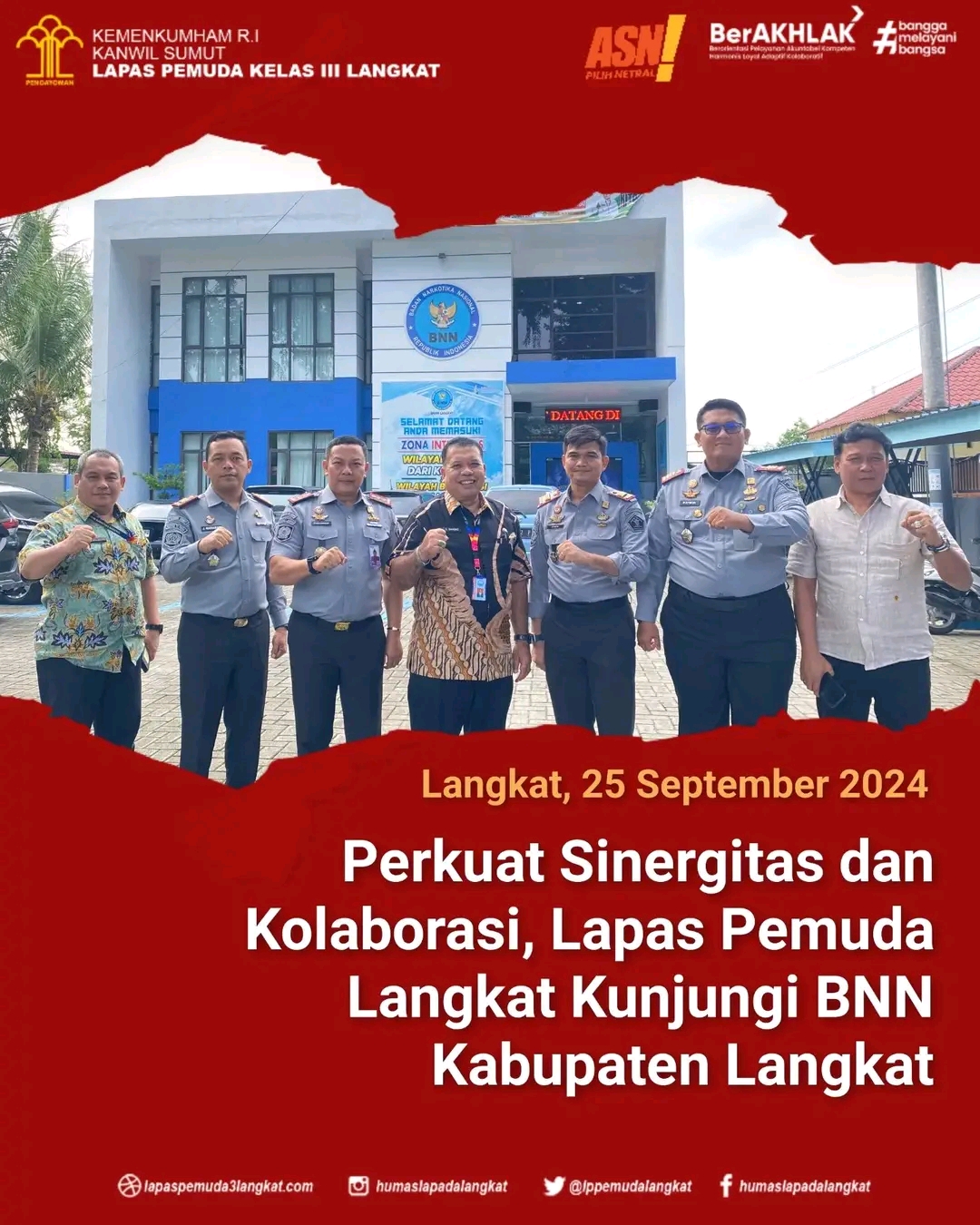 Kedatangan Kalapas Pemuda Langkat, Kalapas Narkotika Langkat, Kepala Rumah Tahanan (Karutan) Tanjung Pura dan Karutan Brandan yang disambut langsung oleh Kepala BNNK Langkat, AKBP S. Bangko, S.H., M.B.A, beserta jajarannya. Bangko menyatakan kesiapan BNNK untuk terus mendukung Lapas dan Rutan pada kabupaten Langkat, terutama dalam program-program pencegahan dan pemberantasan narkotika.