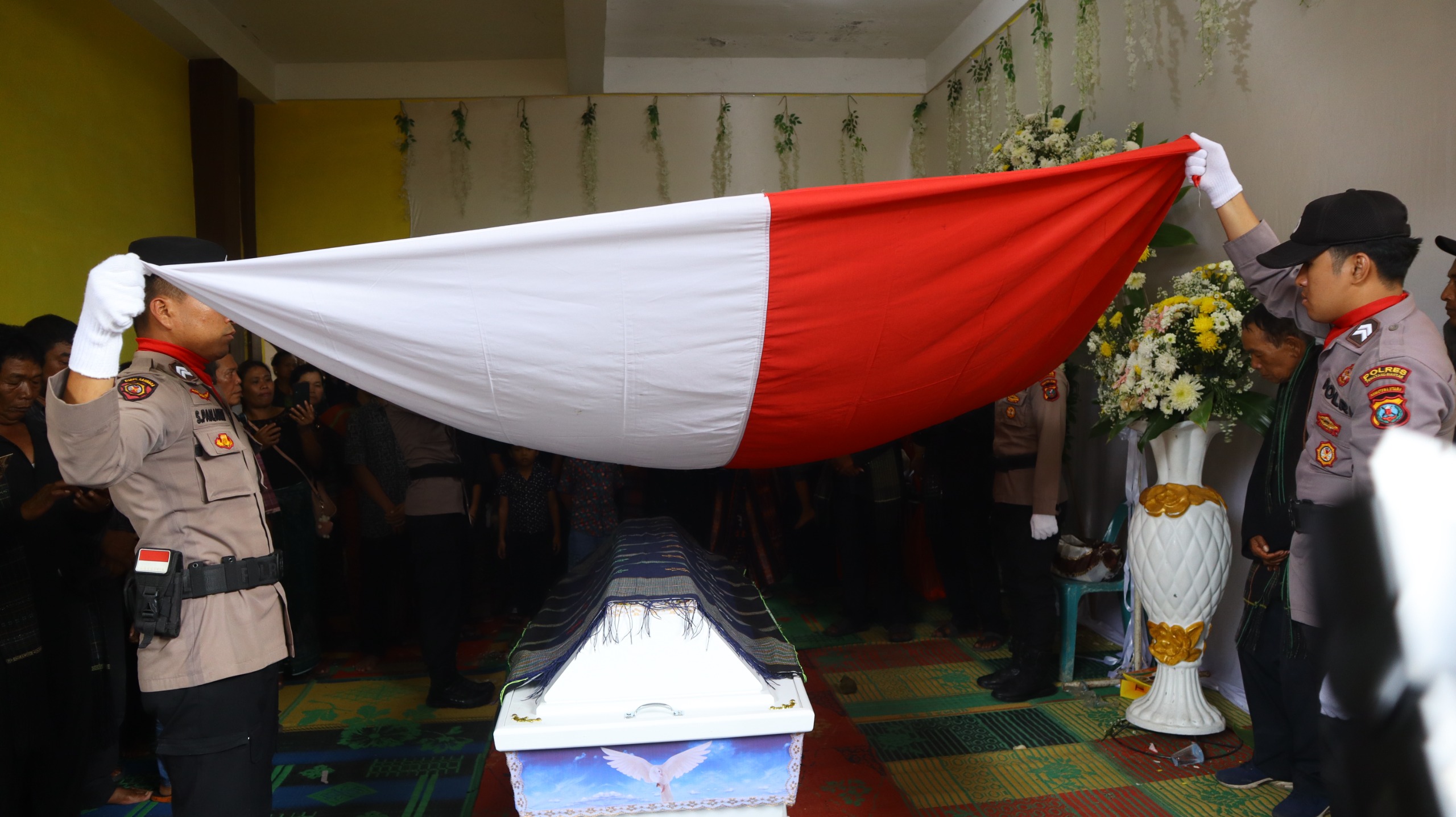 Dalam upacara persemayaman dirangkai dengan peletakan bendera merah putih diatas peti jenazah Almarhum, dilanjutkan penyerahan dari pihak keluarga kepada kepolisian serta penghormatan kepada jenazah dan jenazah siap di berangkatkan untuk dibuktikan.