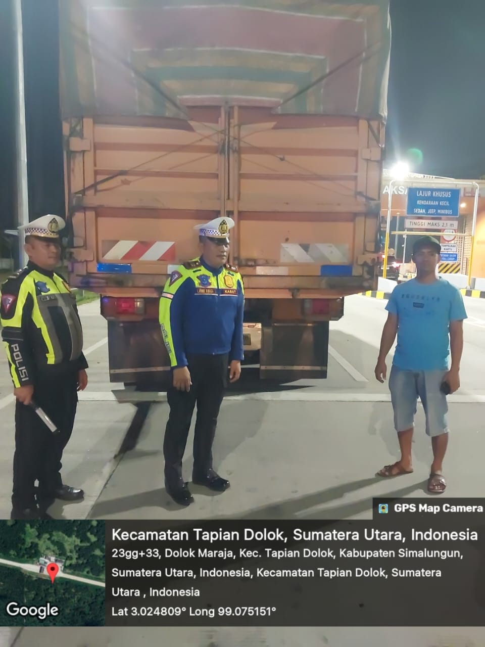 Simalungun || NewsLentera, Satuan Lalu Lintas (Satlantas) Polres Simalungun, dalam rangka Operasi Kepolisian Kewilayahan “Keselamatan – Toba 2025”, melakukan pemasangan stiker skot light di bagian belakang truk yang memasuki pintu tol Sinaksak, Jalan Lintas Sumatera, Dolok Maraja, Kecamatan Tapian Dolok, Kabupaten Simalungun, pada Senin, 10 Februari 2025, sekira pukul 22.00 WIB.