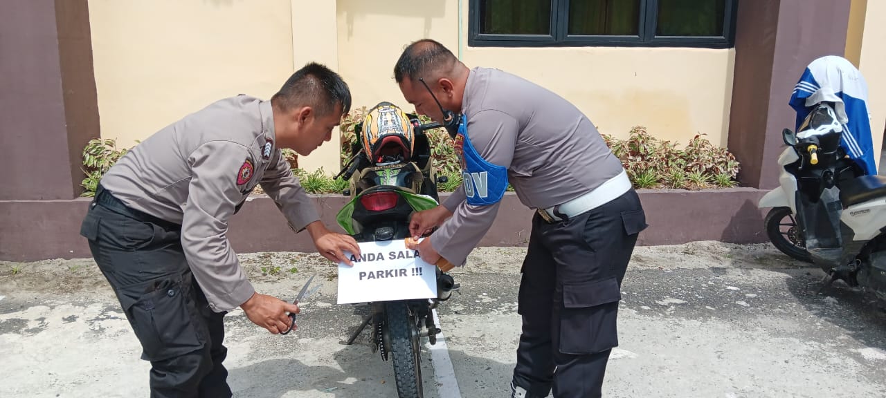 Penertiban parkir sembarangan dilingkungan Polres Pematangsiantar dengan melakukan peneguran dan menempelkan Tulisan ‘’Anda Salah Parkir’’ Di TNKB belakang kendaraan.