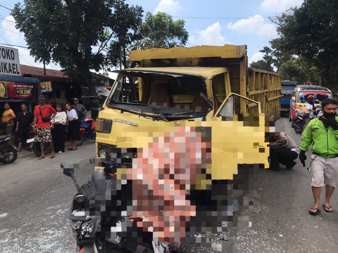 Namun tiba-tiba bagian belakang sepeda motor korban ditabrakan truk Mitsubishi BK 8727 NF yang dikemudikan Ruslan (50) warga Jl. Nirwana Kelurahan Purba Sari, Kecamatan Tapian Dolok, Kabupaten Simalungun yang melaju searah dibagian belakang jurusannya sehingga sepeda motor korban terdorong kedepan hingga menabrak sisi belakang sebelah kanan bak truk Fuso Mitsubishi B 9617 ZU yang berhenti di depan jurusannya tersebut.