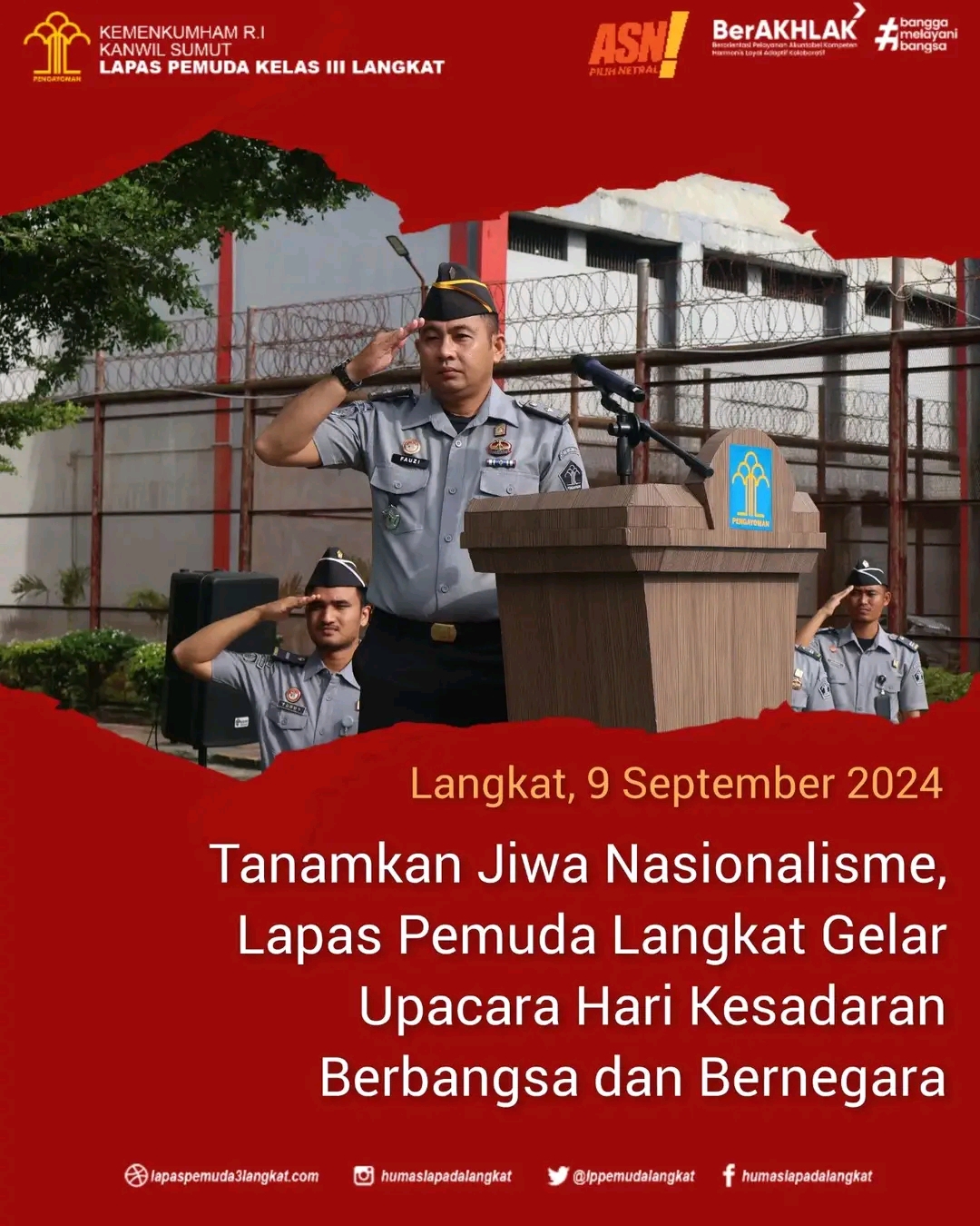 Langkat || NewsLentera, Dalam rangka menumbuhkan rasa kebangsaan dan cinta tanah air serta bela negara kepada warga binaan melalui pelaksanaan upacara kesadaran berbangsa dan bernegara yang dilaksanakan secara rutin untuk mendidik jiwa nasionalisme yang tinggi kepada warga binaan serta untuk memupuk disiplin dan tanggung jawab yang dimiliki sebagai insan yang berakhlak, Lapas Pemuda Langkat Kanwil Kemenkumham Sumut Gelar Upacara. Senin (09/09/2024) di lapangan Upacara Gedung II Lapas Pemuda Langkat.