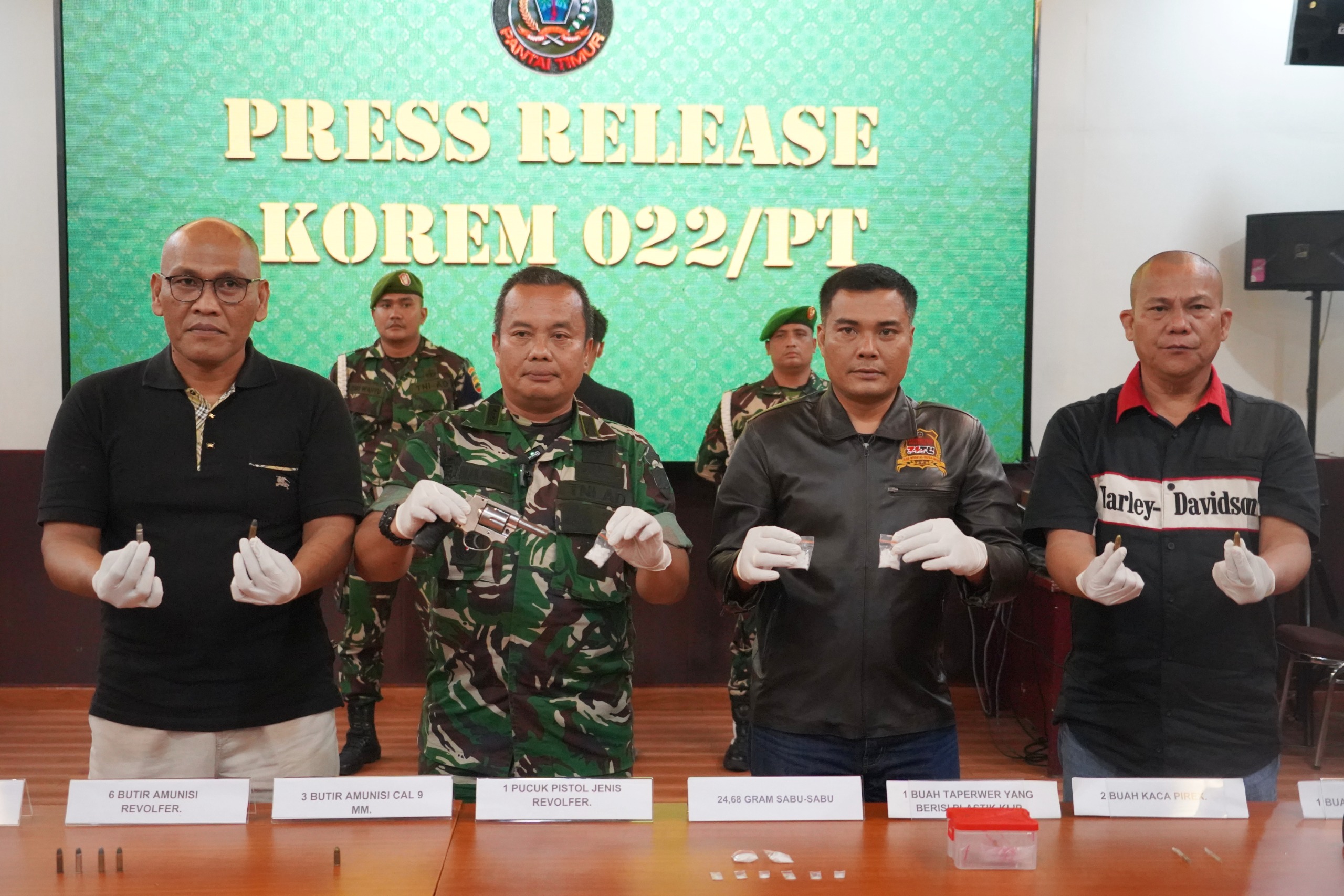 Dari penangkapan tersebut, petugas berhasil mengamankan sejumlah barang bukti, antara lain: 1 pucuk pistol revolver, 3 butir peluru kaliber 9 mm, 6 butir amunisi revolver, narkotika jenis sabu-sabu seberat 22,68 gram, uang tunai sebesar Rp 2.170.000, 1 unit HP merk Realme, 1 buah tas pinggang, 2 buah kaca pirex, 2 buah pipet, serta 1 buah tapperwer berisi plastik klip.