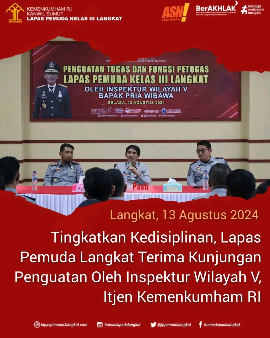 Dalam arahannya, Inspektorat Wilayah V memohon maaf selama dilantik baru kali ini memberikan penguatan kepada jajaran di Lapas Pemuda Langkat, itu indikator menunjukan bahwa Lapas Pemuda Langkat adalah lapas yang tergolong aman dan kondusif.