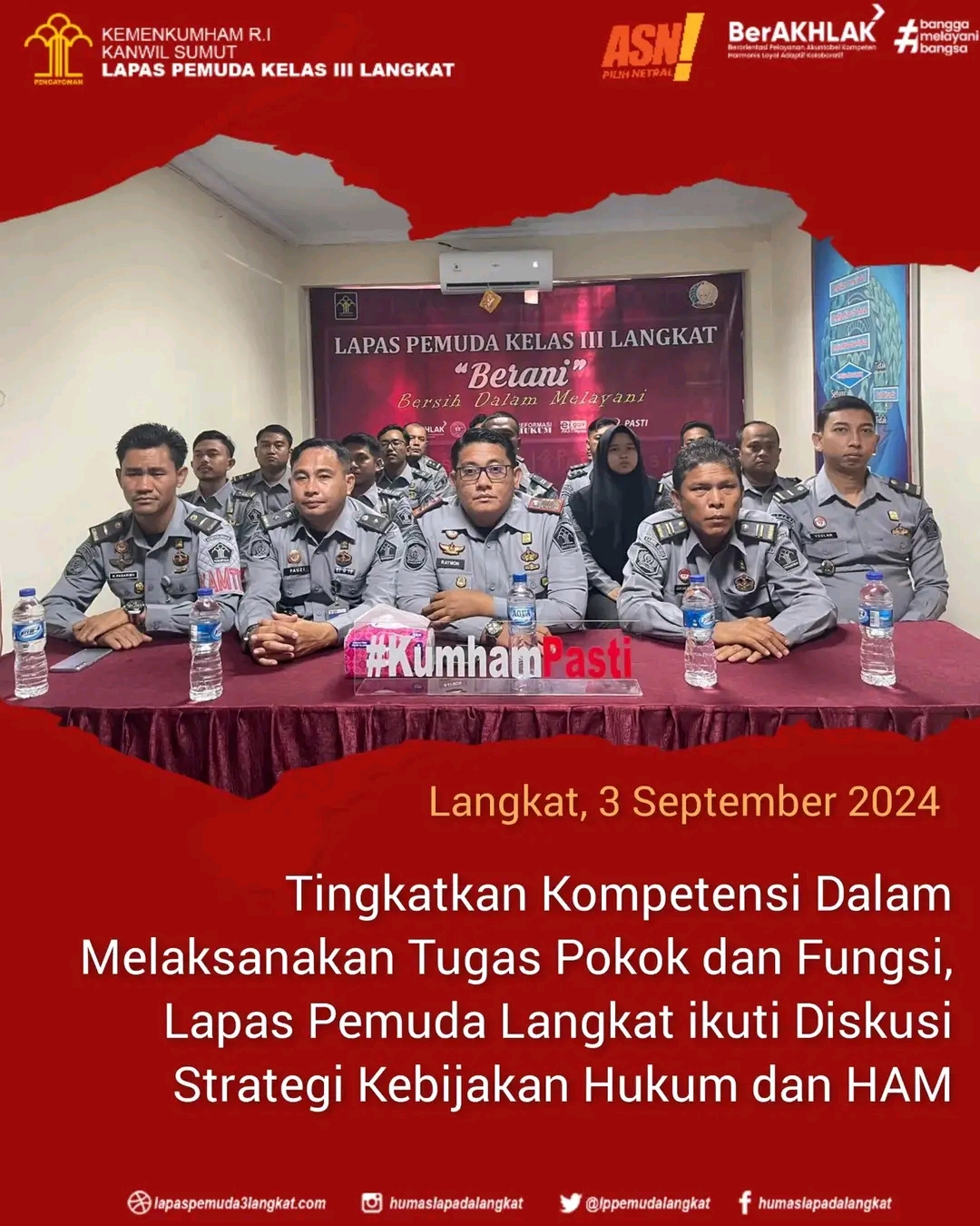 Kegiatan ini diikuti langsung Oleh Kalapas Pemuda Kelas III Langkat, Raymon Andika Girsang, bersama Pejabat struktural beserta staf Lapas Pemuda Langkat. Didalam diskusi tersebut seluruh peserta diberikan materi untuk mendalami berbagai isu krusial seperti reformasi hukum, perlindungan hak-hak tahanan, serta upaya pengurangan tingkat pelanggaran HAM di lembaga pemasyarakatan.